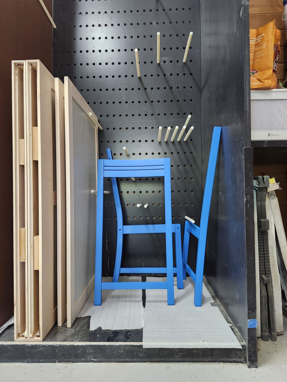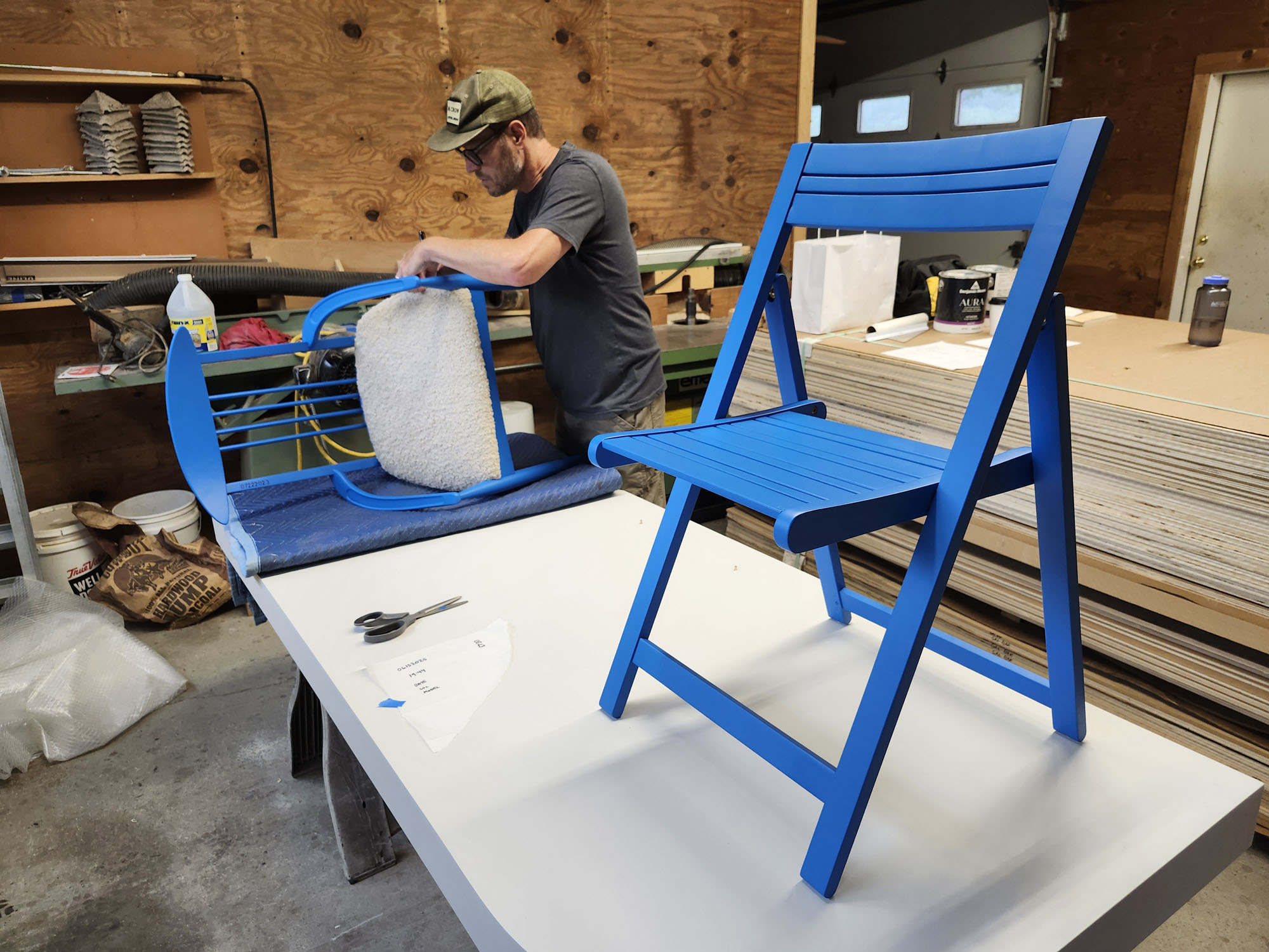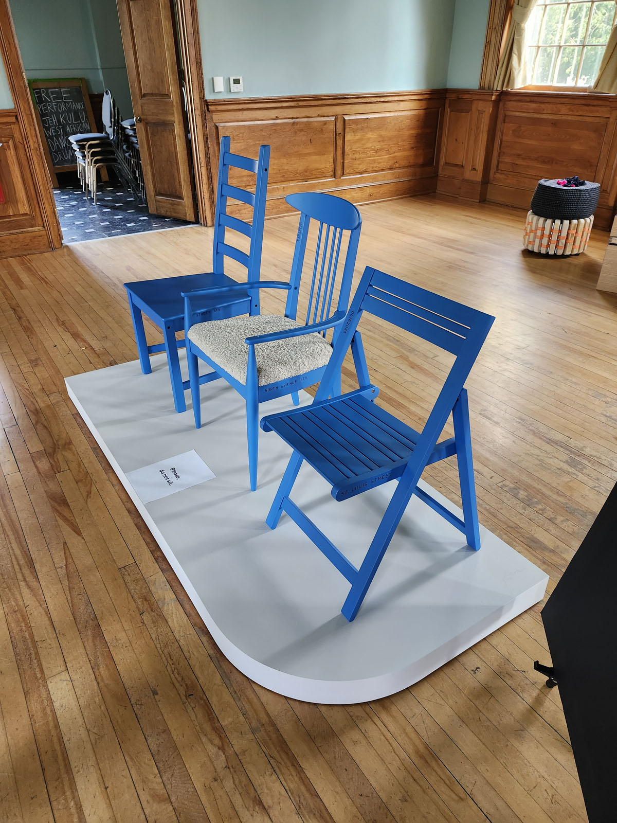 Birdseye's submission to the AIA Vermont Furniture Competition embodies the spirit of rehabilitation, breathing new life into three curb-found chairs by means of giving each a deep cleaning, simple repairs and glue ups, refinishing with an application of leftover paint, re-upholstery with leftover fabrics, and a base constructed of wood cutoffs. The three resuscitated chairs embody a singular ethos of the slow furniture movement and are presented on a platform representing a metaphorical curb.