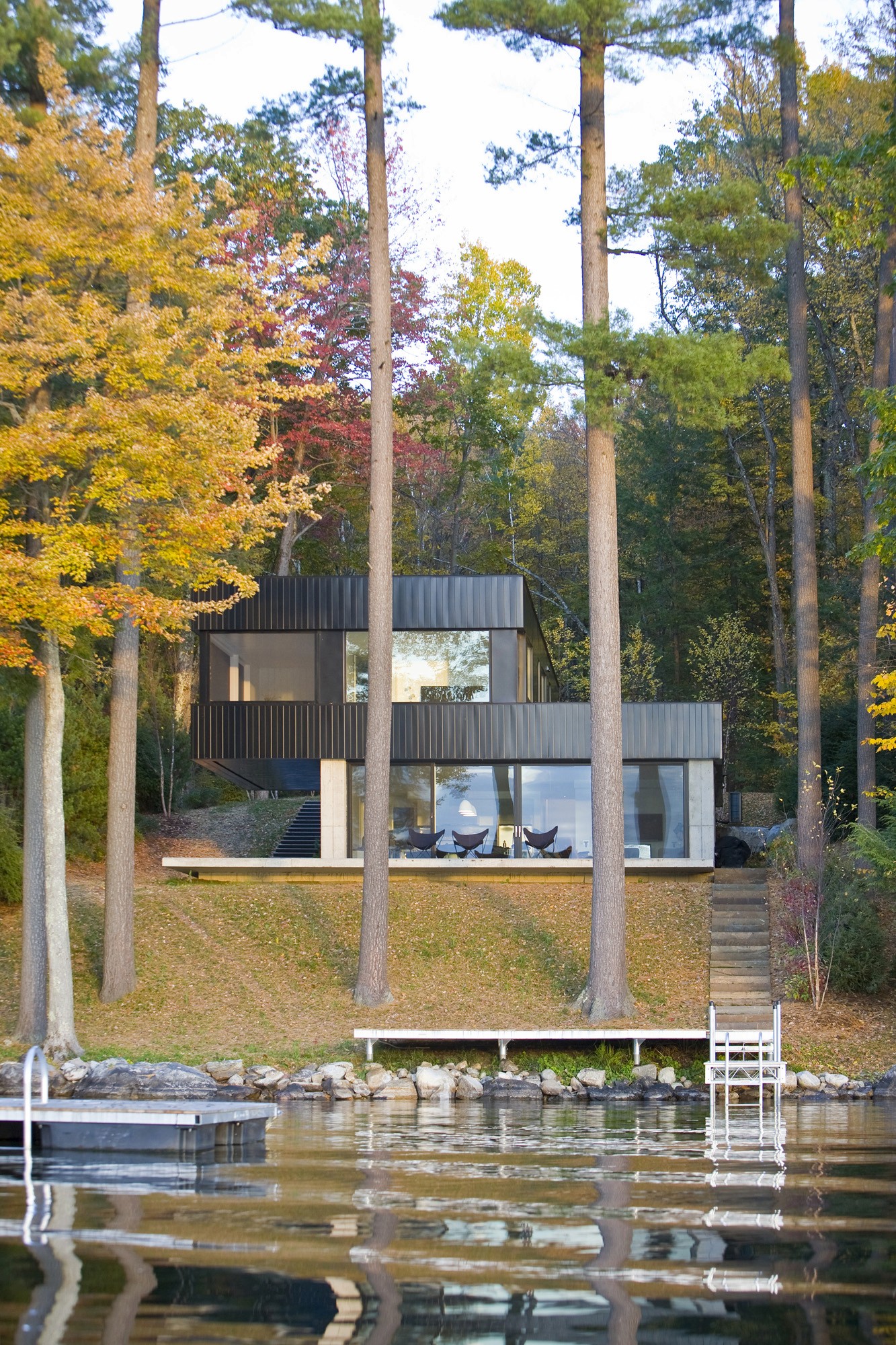 In addition to being placed at different locations along the entry path, both volumes cantilever above the pathway to frame and choreograph the path and views. Maximizing the large elevational drop along the length of the site, the studio, master suite, and living spaces all have distinct elevational vantage points for unimpeded lakefront views. The simple offset forms, along with a minimal material palette, create a subtle presence that situates the project into the existing closely spaced lakefront community.