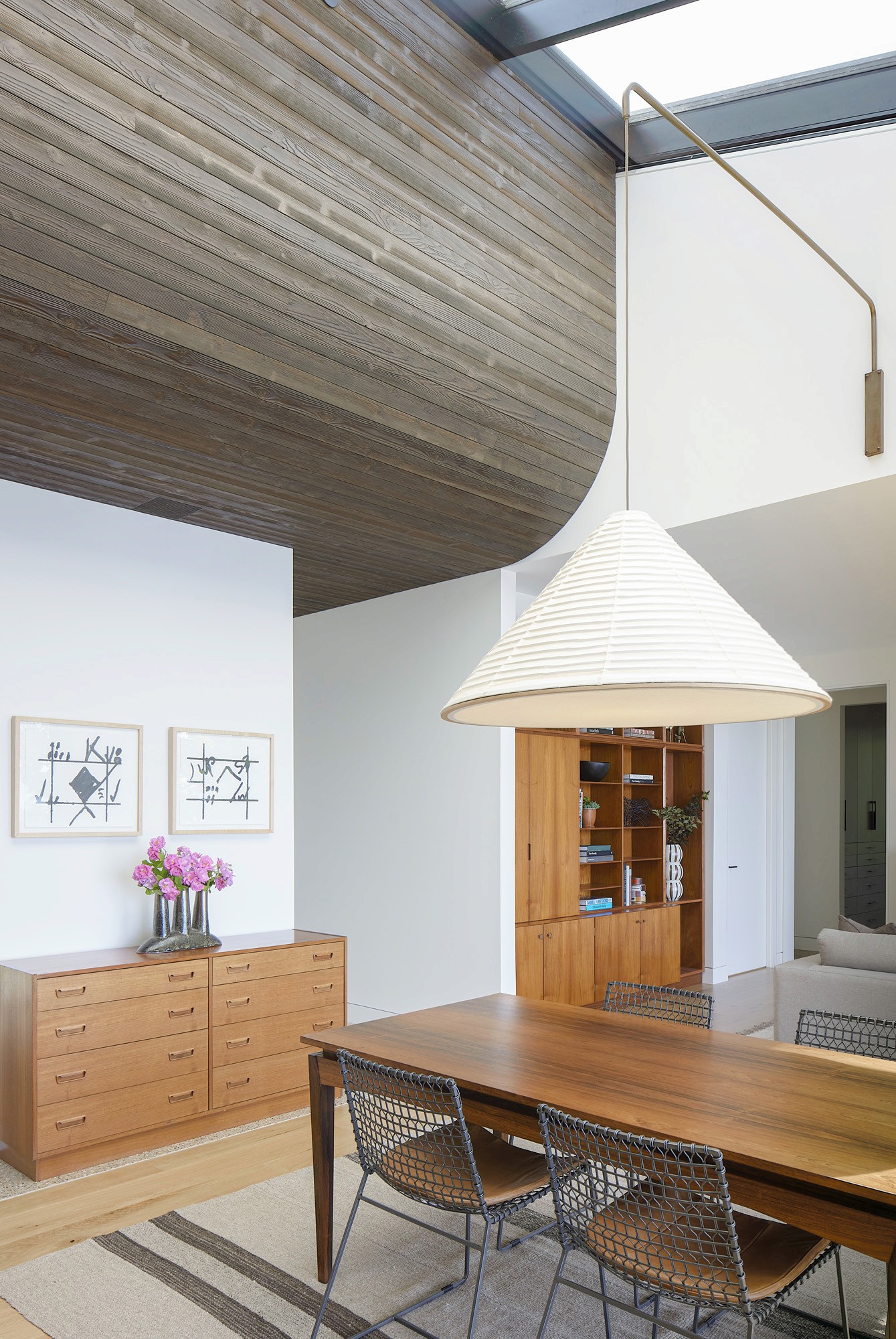 The one-bedroom home on the shores of Lake Champlain is sided with Corten steel and features a kitchen/living room skylight as a striking design feature, as well as plenty of glazing to highlight the lake view.